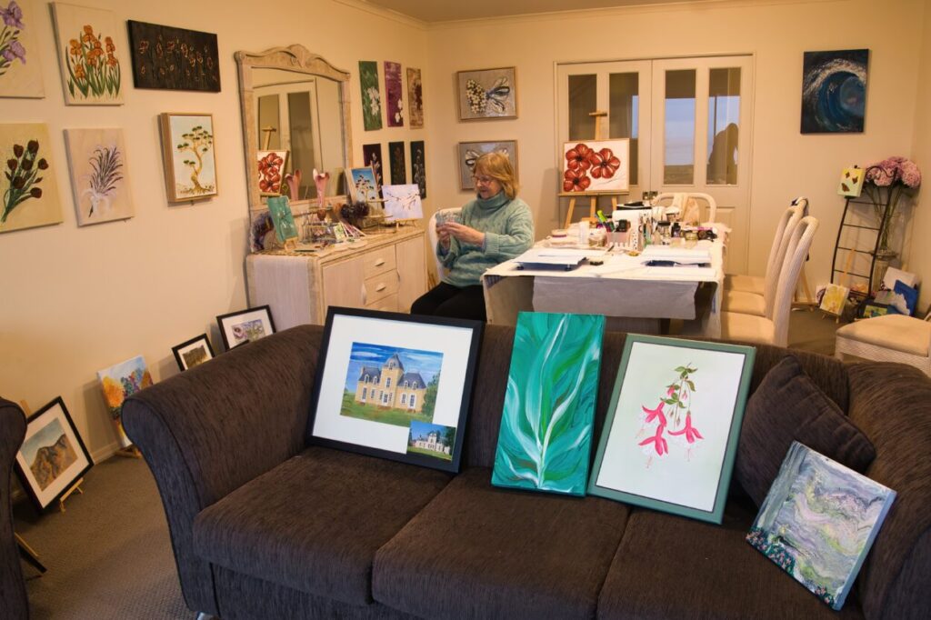 What was once my dining room has been lovingly transformed into a vibrant and welcoming gallery space – a place where creativity lives and breathes. This repurposed room now showcases not only my own arts and crafts, but also the work of three talented friends who generously share the space with me.