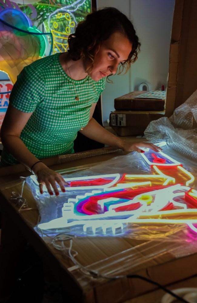 Her latest works are original, hand-painted LED panels — laser-cut, layered with texture, and designed to glow both on and off the wall. These pieces featured in The Potluck, a collaborative exhibition with local creatives, and mark a shift from commercial signage to luminous, one-off artworks.